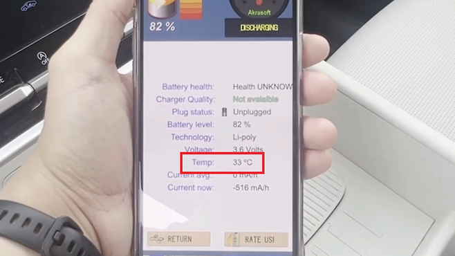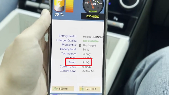 출발 당시 스마트폰의 온도는 31도로 표시됐고, 정확한 측정을 위해서 무선 충전 패드에 올려둔 상태로 목적지에 도착할 때까지 일절 사용하지 않았다.