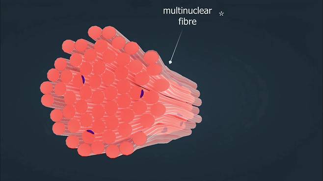 골격근은 여러 개의 핵을 가진 ‘다핵세포’로 구성돼 있으며, 여러 개의 위성줄기세포(satellite stem cell)가 합쳐지는 구조로 형성된다. 근육이 스트레스를 받거나 손상이 발생했을 때, 위성줄기세포가 분열해 새로운 근육 세포를 생성하면서 기존의 다핵세포 구조를 유지하는 방식이다.