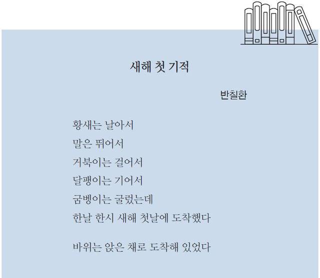 새해를 맞이하면서 세상 만물이 숨을 고르는 장면을 상상합니다. 저마다 자기다운 모습으로 새해에 도착하는 모습이 그려지나요? 생애주기가 다르고 겉모습과 걸음걸이가 달라도 정확히 한날한시에 새해를 맞이하는 우리들! 이 시는 지구에 사는 생명체가 ‘우리’로 묶일 수 있음을 깨닫게 합니다. 사는 일은 참 거룩한 일이지요. 저마다 새 날을 향해 발돋움하고, 목숨을 지키려 애쓰며 살고 있잖아요.