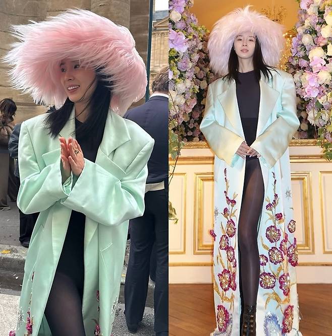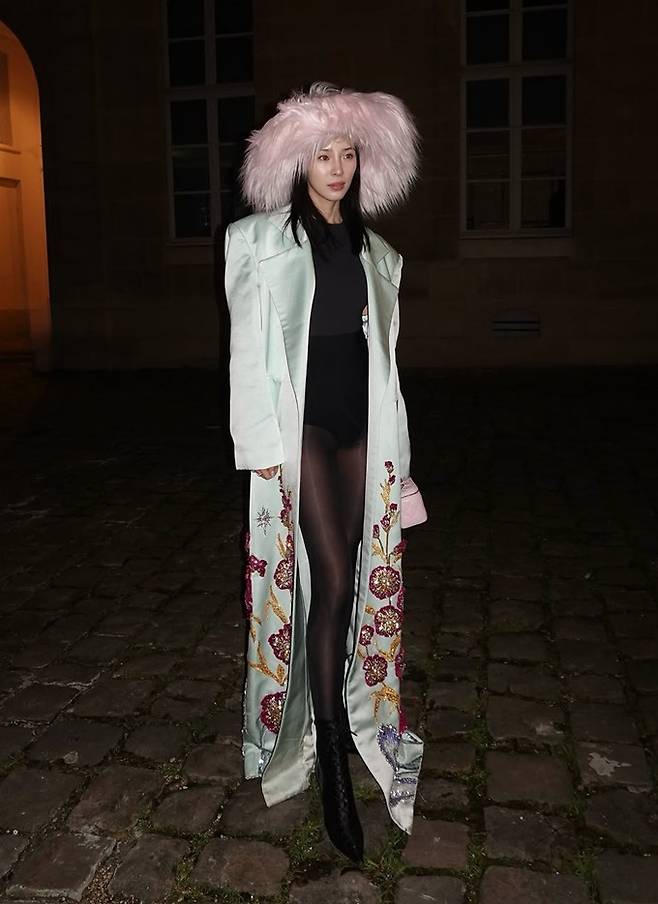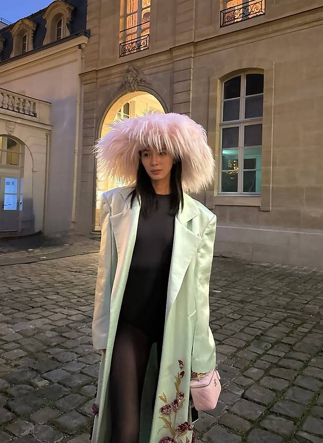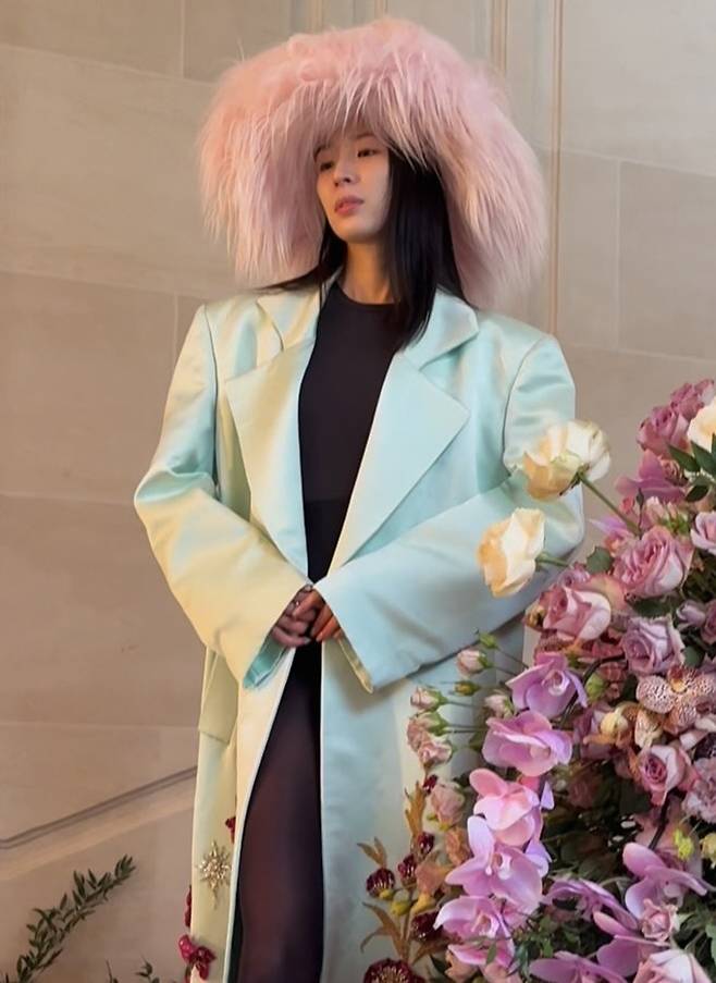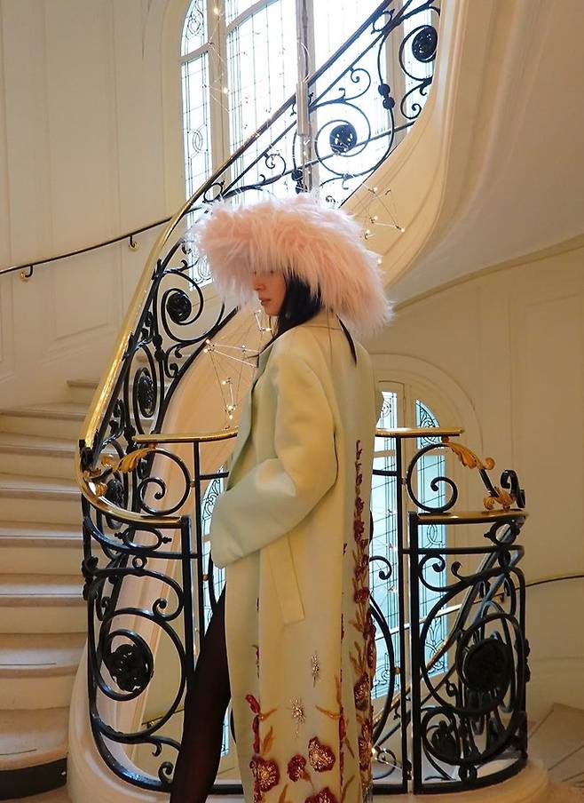 공개한 사진에서 아이린은 핑크 깃털 모자를 쓰고 블랙 바디슈트와 스타킹에 9등신 몸매가 살짝 드러난 블루 컬러의 코트를 걸친 패션쇼 나들이룩으로 눈길을 사로잡았다.
