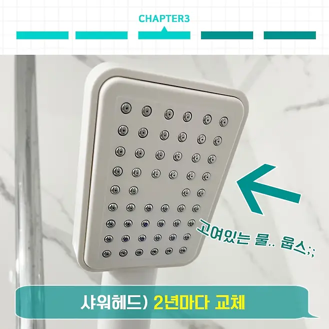 따라서 샤워기 호스를 비롯해서 헤드는 2년에 한 번 씩 교체하는 것이 좋아요. 호스는 자주 교체하면서, 헤드를 신경쓰지 않는 분도 계시더라구요. 필터가 있는 제품이여도 주기적으로 교체해야하는 것은 마찬가지라는 거 꼭 기억해요~