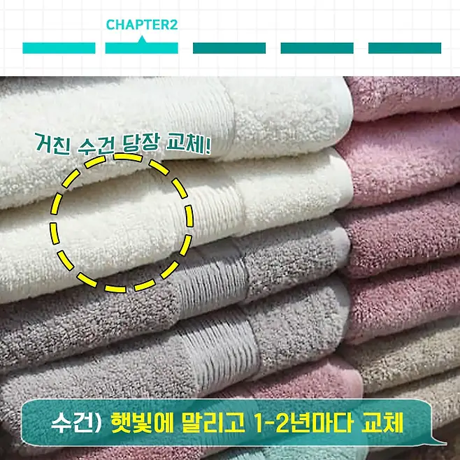 수건도 한 번 구매하면 거의 평생을 사용하지 않으시나요? 수건도 은근 자주 교체해야 하는 생활템! 2년은 자주 세탁하고 관리했을 때의 기준이고, 표면이 거칠어졌다면 바로 교체해주세요. 거칠어진 수건의 표면에선 세균 증식의 위험도가 배로 상승하니까요.