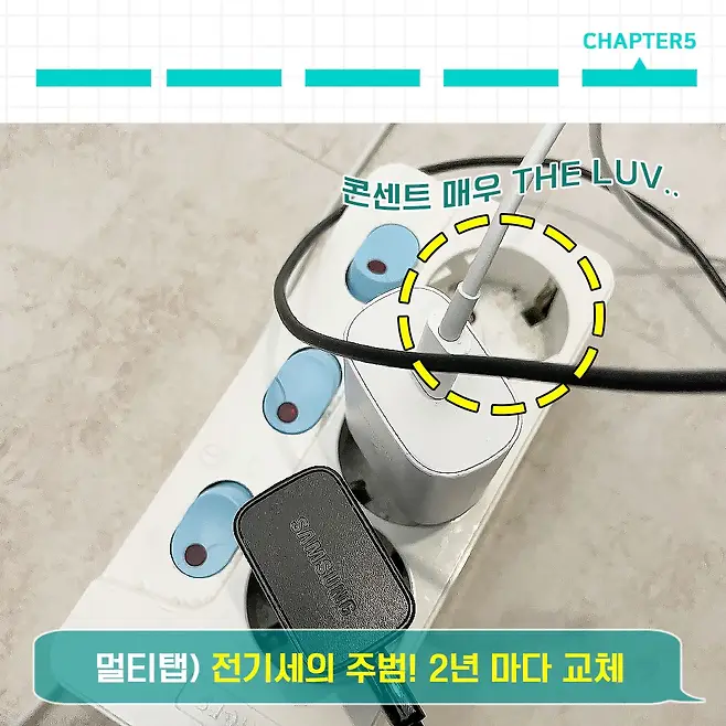 멀티탭을 오래 사용하면 할수록 기능이 저하되고, 결국 전기세 상승에 주범이 된다구요~ 또한 쌓여있는 먼지로 인해 전기사고 혹은 화재로 이어질 가능성도 높아요. 따라서 주기적으로 교체해주어 안전사고와 전기세 절약까지 실천해요!