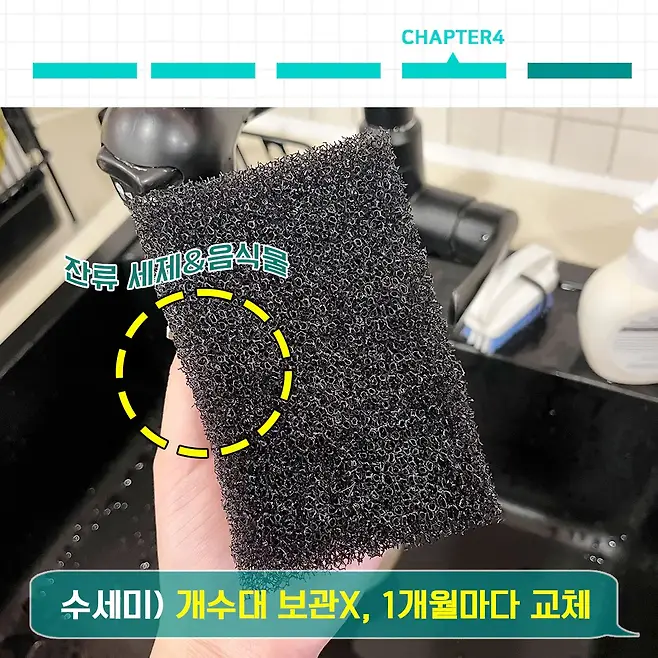 깨끗하게 먹으려고 설거지 하는데.. 오히려 세균으로 닦는 꼴이라뇨?! 따라서 수세미는 자주자주 교체해주는 것이 좋아요. 또한 사용 후에는 개수대 안에 걸어두는 대신 물세탁 후 햇빛에 말려주세요.