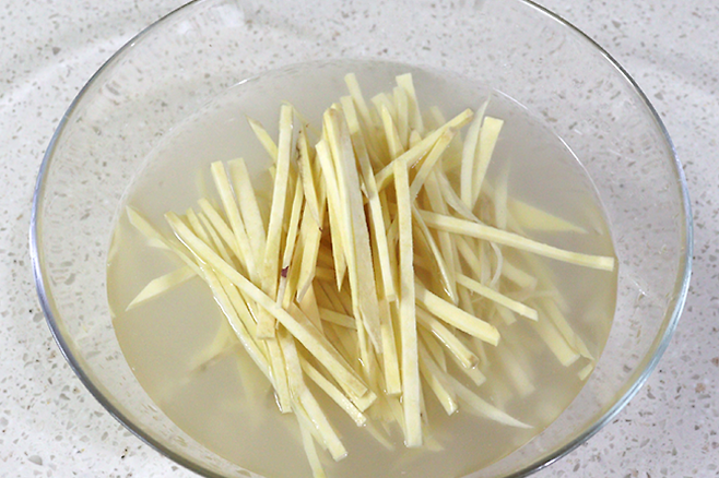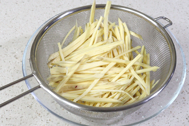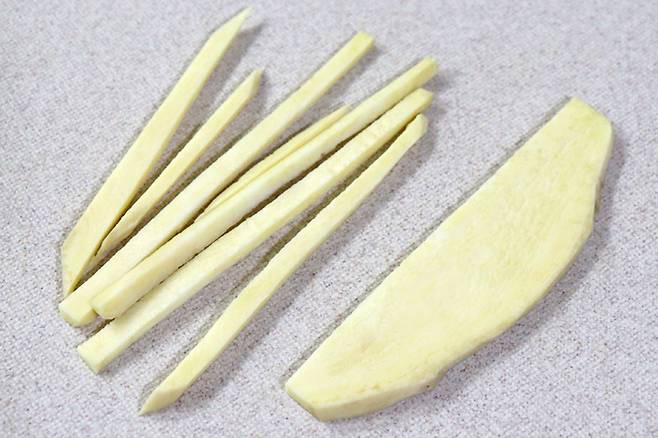 깨끗이 씻어 껍질을 벗긴 다음, 길쭉하게 스틱 모양으로 자릅니다.