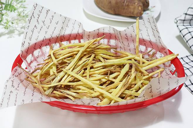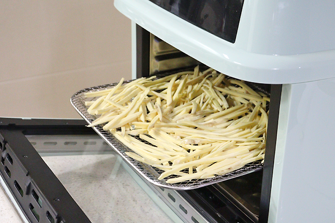 고구마의 크기나 양에 따라 달라질 수 있으니, 원하는 바삭함이 될 때까지 중간중간 확인하며 시간을 조절합니다.