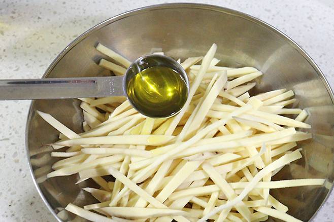 큰 볼에 채 썬 고구마를 넣고, 올리브오일 1스푼 반을 넣어 조물조물 골고루 섞어주세요.