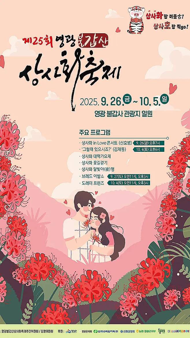 - 공식 캐릭터 ‘상사호’: 상사화를 사랑한 불갑산 호랑이를 모티브로 한 귀여운 캐릭터가 축제 곳곳에서 포토존과 이벤트로 활약한다.