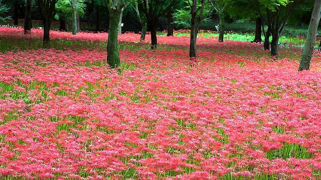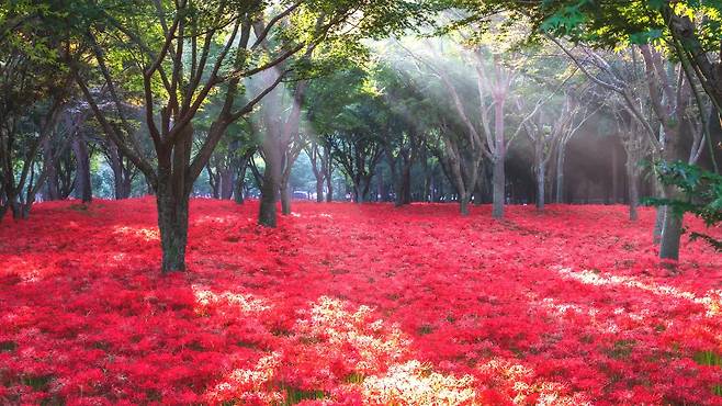 가을, 영광 불갑산에선 산 전체가 붉은 물결로 일렁인다. 꽃과 잎이 서로 만날 수 없어 ‘이룰 수 없는 사랑’이라 불리는 상사화.