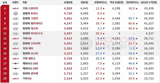 SUV 라인업에서는 가장 작은 차 캐스퍼(3908대)와 가장 큰 차 팰리세이드(4147대)의 경쟁이 치열하다. 누적 차이는 2107대로, 근소하게 팰리세이드가 앞서고 있다. 11월과 12월 실적에 따라 충분히 뒤집힐 수 있는 숫자다.