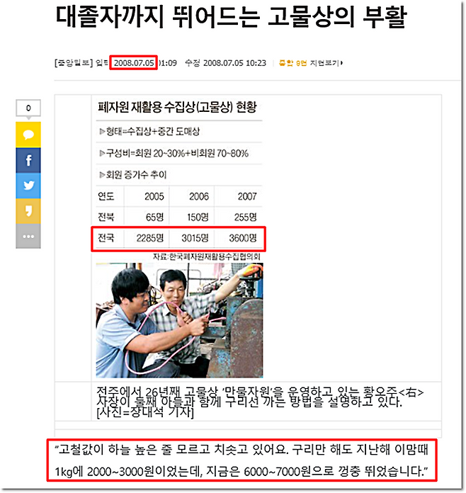 사실 고물상이 사업적으로 큰 주목을 받기 시작한 것은 지금으로부터 10여 년 전입니다. IMF 이후 실직자들이 대거 고물상업에 뛰어들면서 경쟁이 치열해지기 시작하더니 2000년대 중반 이후 고철 등 원자잿값이 오르면서 고수익 사업으로 주목받기 시작한 것인데요. 2008년 중앙일보에는 '대졸자까지 뛰어드는 고물상의 부활'이라는 제목의 기사에 실제로 대학 졸업 후 13년간 직장 생활을 하다가 고물상을 개업한 41세 남성의 사연이 소개되기도 했습니다. 당시 사연의 주인공은 "사업 1년 만에 월급쟁이 시절보다 수입이 3~4배 많아졌다"라며 매출이 늘면서 직원도 2명이나 채용했다고 전했습니다.