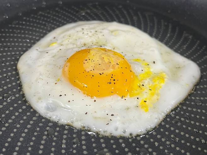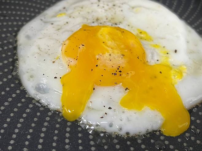 흰자는 거의 익고, 노른자는 촉촉하게 유지된 상태가 보이시나요? 이제 불을 끄시고 여기에 후추나 시즈닝 등 원하는 양념을 뿌려 드시면 됩니다.