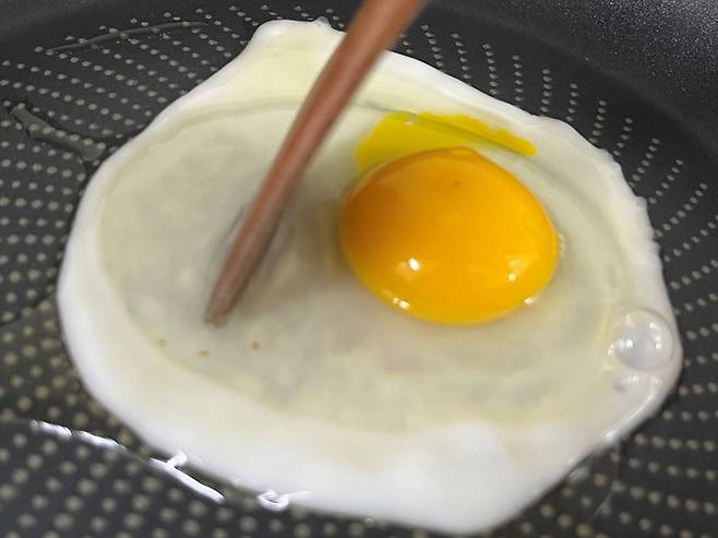 대신 흰자 부분은 주걱이나 뒤집개로 흠집을 계속 내주세요. 이렇게 하면 뚜껑 덮고 익히지 않아도 흰자가 완벽하게 익습니다.