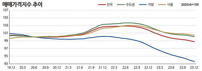 우선 전국적으로 얼마나 사고 팔았는지 가격표 입니다. 집값 상승기인 '21년 말부터 '22년까지 상승세를 유지하다 쭉쭉 떨어집니다.