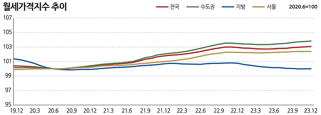 위의 선과 반대로 가고 있죠? 오피스텔 월세가격지수 추이입니다. 오히려 상승하고 있는데요, 오피스텔이 주택수에 포함되면서 매매를 꺼리게 됐고요, 전세보증금 반환에 대한 우려, 대출이자 부담 등으로 전세수요가 월세로 이동하게 됐습니다.