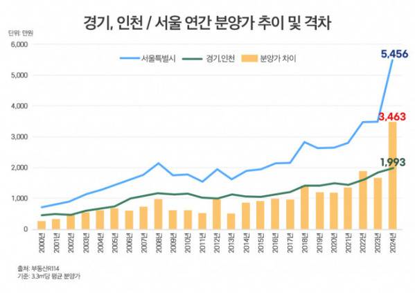 15일 부동산 정보업체 ‘부동산R114’에 따르면, 올해(11월 둘째 주 기준) 서울 아파트의 3.3㎡당 평균 분양가는 5456만 원으로 역대 최고치를 경신했다. 같은 기간 경기, 인천 2개 지역의 3.3㎡당 평균 분양가는 1993만 원으로 서울보다 3463만 원 낮았다. ‘국민평수’로 불리는 전용면적 84㎡ 한 채로 따지면 약 11억4000만 원이 차이 나는 셈이다.