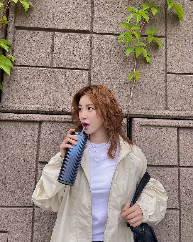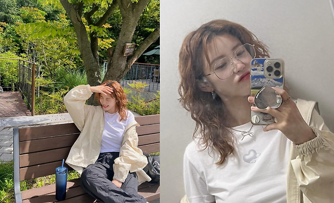 사진 속 전효성은 하트 로고가 있는 흰색 반팔티와 블랙 카고바지와 노란색의 바람막이를 입었다. 히피펌의 변신까지 더하여 러블리한 캐주얼룩을 선보였다.