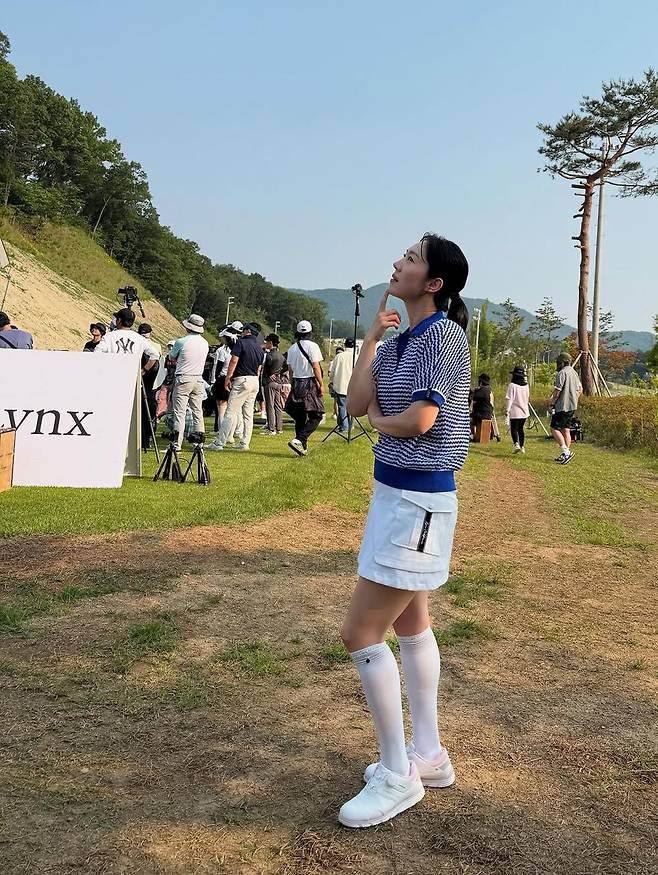 그녀는 블루와 화이트 컬러가 조화를 이룬 하프 집업 니트 톱을 착용해 안정감 있는 데일리 무드를 연출했다. 단정한 카라 디자인과 간결한 실루엣이 얼굴을 더욱 또렷하게 돋보이게 했으며, 상체 라인을 깔끔하게 정돈해주는 점도 인상적이다. 특히 햇살에 반짝이는 피부와 은은한 생기 메이크업이 어우러져, 아나운서 특유의 단아함과 발랄한 분위기를 동시에 자아냈다.