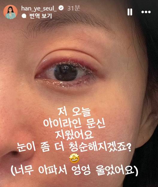 22일 한예슬은 “저 오늘 아이라인 문신 지웠어요”라며 빨개진 눈을 보여줬다.