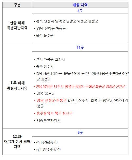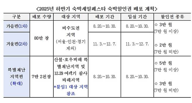 또 산불 피해지역으로 지정된 산청·하동·안동·영덕·영양·의성·청송·울주 등과 12.29 여객기 참사 지역, 호우 피해 지역 등을 특별재난지역으로 정해 할인혜택을 확대해 지원하는데요! 숙박상품이 7만 원 이상일 경우 5만 원, 7만 원 미만일 경우 3만 원의 할인을 받을 수 있어요.