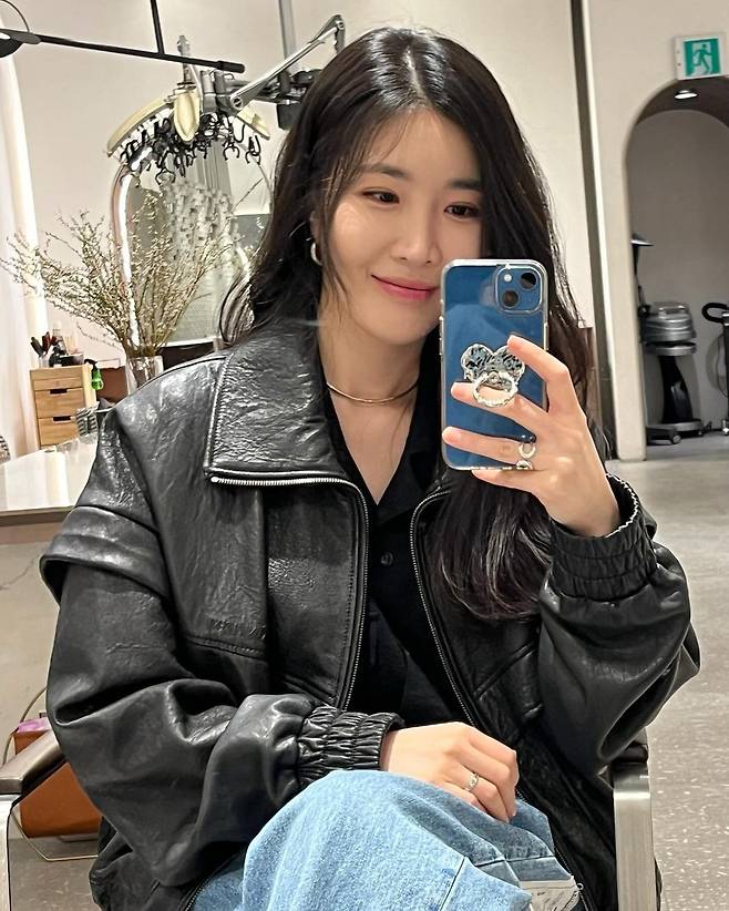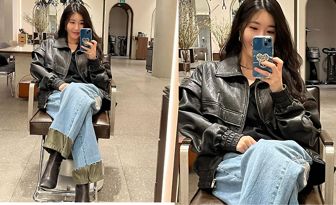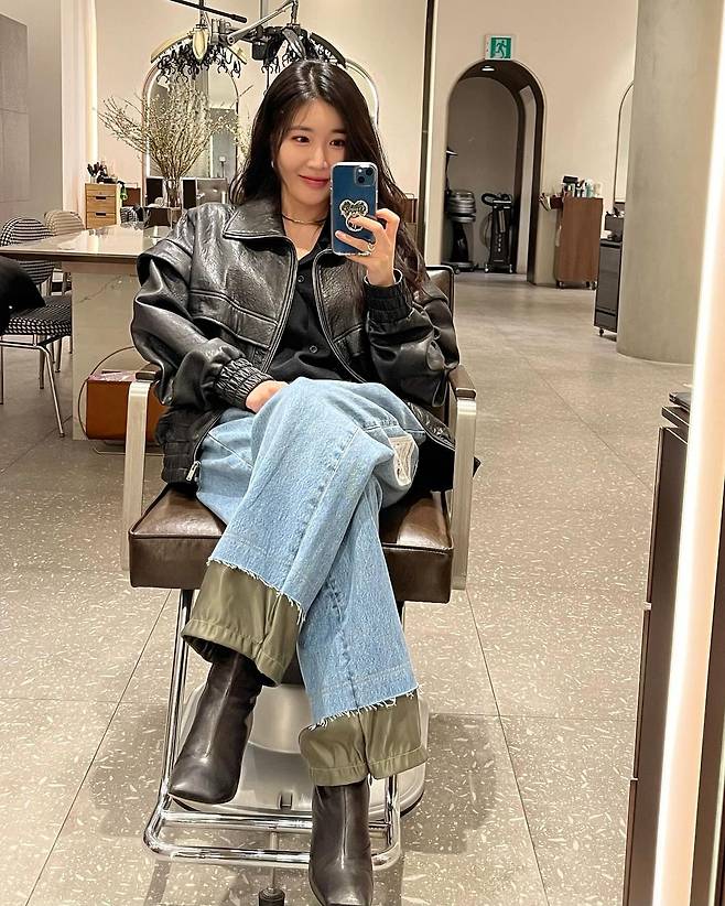 사진 속 이해리는 블랙 티를 이너로 입고 블랙 가죽 자켓과 밑단의 카키가죽이 포인트인 청바지와 부츠를 신고 미용실룩을 선보였다.