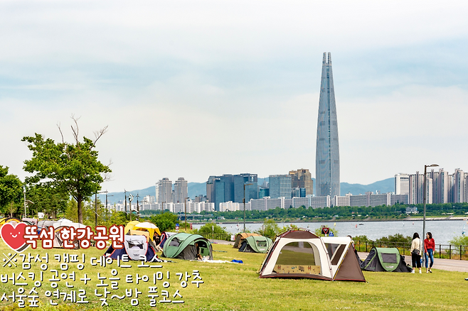 뚝섬은 캠핑 한강 데이트 코스의 정석 같은 곳인데요. 한강캠핑존에서는 미리 예약하고 감성 캠핑 세트를 즐길 수 있고, 평소에는 잔디밭에 앉아 간단한 피크닉이나 음악 감상하기도 좋죠.