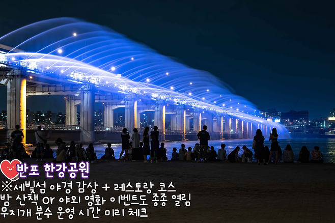 한강 데이트 코스에서 가장 로맨틱한 반포 한강공원입니다. 해 질 무렵이 되면 반포대교 전역에 무지개처럼 빛나는 달빛 무지개 분수가 압도적인 분위기를 연출하죠. 특히 여름철엔 분수 시간에 맞춰 돗자리 깔고 구경하는 커플들이 정말 많아 자리 선점이 중요할 정도랍니다.