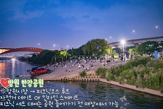 피크닉 세트 대여 샵들도 SNS에서 많이 운영하고 있어서 감성 돗자리, 테이블, 빈티지 소품까지 완벽하게 갖춰놓고 인증샷도 남기기 좋습니다. 한강 데이트 코스의 정석, 망원 한강공원에 방문해 아름다운 추억을 쌓아보세요.