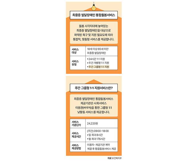 돌봄 사각지대에 놓였던 최중증 발달장애인은 상반기 중 맞춤형 통합 돌봄서비스를 이용할 수 있게 됩니다. 최중증 발달장애인은 자해·타해와 같은 도전행동으로 인해 기존 서비스를 이용하기 어려웠습니다. 이에 정부는 맞춤형 통합 돌봄서비스를 통해 최중증 발달장애인도 지역사회에서 활동할 수 있도록 하고 가족의 돌봄 부담을 덜어낼 수 있도록 하겠다는 것입니다.