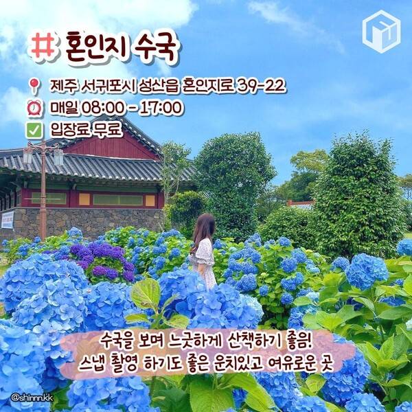 혼인지에서는 편하게 수국을 볼 수 있기 때문에 종달리 수국길을 드라이브 코스로 지나오는 것을 추천합니다. 또한 수국은 토양에 따라 꽃의 색깔이 다르다고 하는데, 혼인지에서는 대부분 파란 수국을 감상하실 수 있습니다.