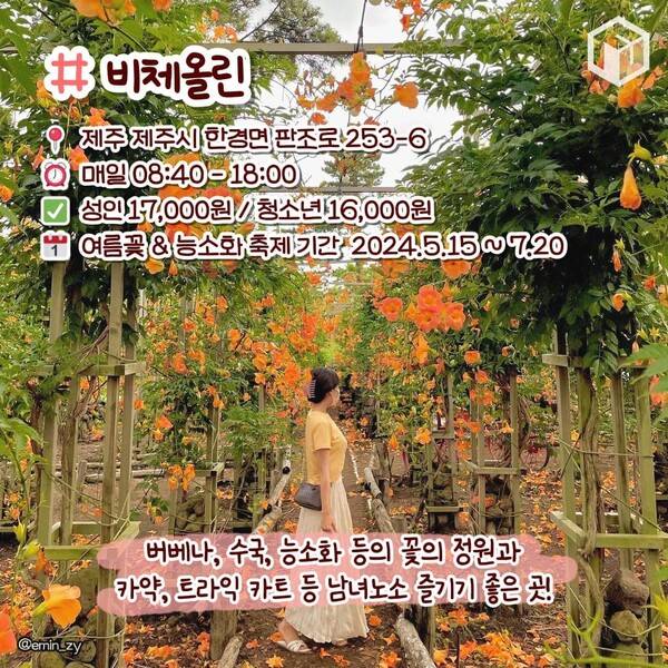 축제가 진행되는 비체올린 능소화 정원은 샤스타데이지, 버베나, 수국과 함께 끝없이 펼쳐지는 압도적인 규모이며 능소화와 함께 잘 어우러지는 제주 전통 소품과 인생샷을 남길 수 있는 다양한 포토존이 마련되어 있습니다.
