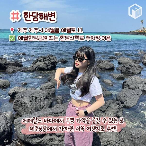 한담해변은 제주 북서부에 위치하여 애월에서 곽지까지 해안을 따라 이어집니다. 제주시가 2009년 숨은 비경 31로 선정했으며, 맑고 투명한 바다로 유명한데요. 해안의 모양을 따라 구불구불하게 이어지는 산책로는 1.2km에 이릅니다.