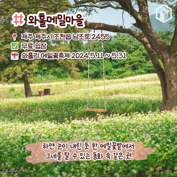 제주 북동부에 위치한 중산간 마을인 와흘리는 ‘메밀마을’이라는 별칭답게 봄이 끝나갈 무렵이 되면 소금을 뿌린 듯 흰 꽃으로 뒤덮인 메밀밭이 펼쳐 쳐지는데요. 와흘리 메밀밭은 이모작을 해서 봄과 가을에 하얀 메밀꽃을 만나볼 수 있습니다.