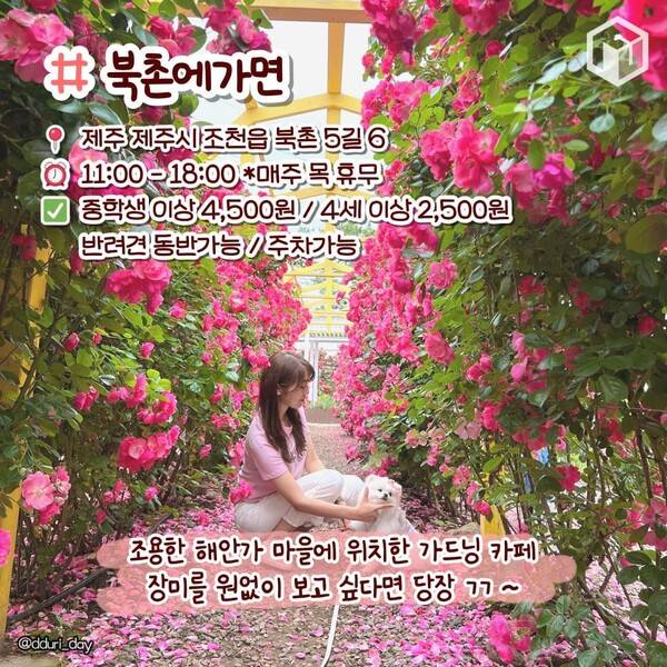 제주도여행 계획 중에 제주장미를 원 없이 보고 싶다면 필수방문코스로 추천드립니다. 또한, 조천 북촌에가면 카페는 커플, 가족과 함께 사진을 찍기 좋은 포토스팟이 많은 제주 사진 명소입니다.