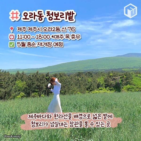 제주 오라동 청보리밭은 시즌별로 청보리 축제와 메밀꽃 축제를 진행해 왔으며, 아름다운 자연을 배경으로 사진을 찍기 위해 많은 관광객이 찾는 곳입니다. 2024년에는 5월 중순부터 재개장을 시작한다고 하니 놓치지 마세요!