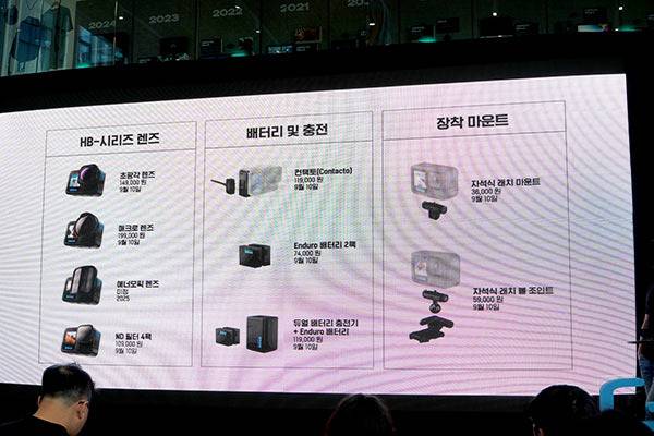 마찬가지로 9월 10일에 출시되는 컨택토, Enduro 배터리 2팩, 듀얼 배터리 충전기+Enduro 배터리, 자석식 래치 마운트, 자석식 래치 볼 조인트는 각각 119,000원, 74,000원, 119,000원, 36,000원, 59,000원에 출시된다.