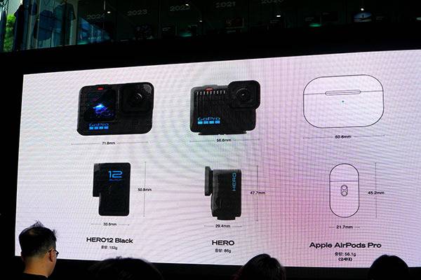 이번 발표회에는 크게 2가지의 제품을 소개하였는데, 고프로 히어로는 86g의 초경량 액션캠으로 현존하는 고프로 모델 중 가장 작은 크기와 가벼운 무게를 자랑한다. 가로 길이 역시 56.6mm로 기존 고프로 히어로 블랙 모델에 비해 20% 가량 작아진 걸 확인할 수 있었으며 이는 디스플레이를 탑재했음에도 불구하고 이뤄낸 성과다.