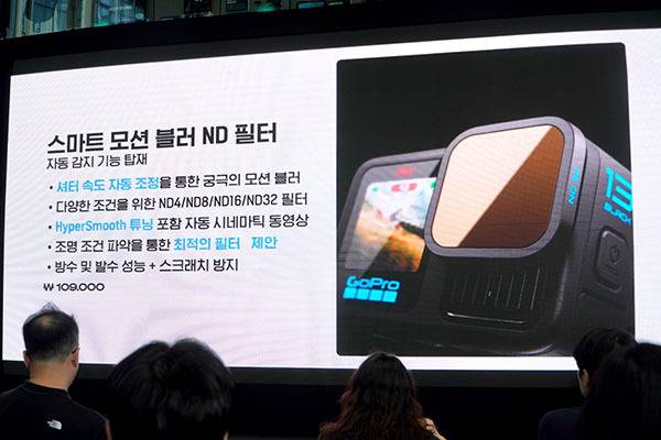 다음은 파블로 리마 부사장이 최애(?) 기능이라 밝힌 ND필터의 소개가 이어졌다. 스마트 모션 블러 ND 필터라고 명칭한 고프로의 ND필터는 기존 ND필터와 달리 전문적인 카메라 지식이 없더라도 ND필터를 사용할 수 있도록 돕는 기술이 담겨 있다. 사용자가 ND필터를 장착만 하게 되면 고프로가 광량을 체크하여 어떤 ND필터를 사용하는게 적합한지를 알려줘 편리하게 사용할 수 있다.