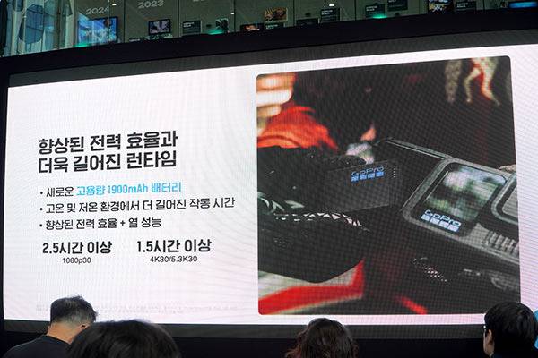 고프로 히어로13 블랙은 전작과 비교해 많은 게 변화하였다. 렌즈에 이어 배터리 역시 변화의 핵심이다. 새로운 고용량 1,900mAh 배터리를 통해 고온 및 저온 환경에서 더욱더 오랜 시간 작동할 수 있게 되었으며, 이는 고프로가 전력 효율과 발열 제어를 이뤄냈기에 가능한 성과다. 고프로 히어로13 블랙은 1080p30에서 2시간 30분 이상, 4K30/5.3K30 환경에서는 1시간 30분 이상 작동한다고 전했다.