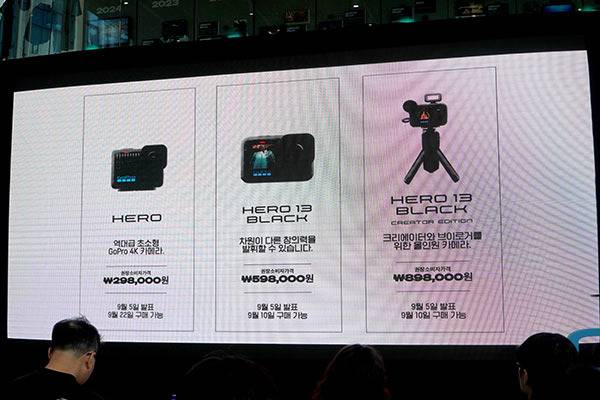 이번 발표된 제품들의 가격은 각각 히어로 298,000원, 히어로 13 블랙 598,000원, 히어로 13 블랙 크리에이터 에디션 898,000원이며 각각 9월 22일, 9월 10일, 9월 10일 구매가 가능하다. 액세서리는 각각 초광각 렌즈 149,000원, 매크로 렌즈 199,000원, 애너모픽 렌즈 미정, ND 필터 4팩 109,000원이며 애너모픽 렌즈를 제외한 렌즈 3가지는 9월 10일 출시된다.
