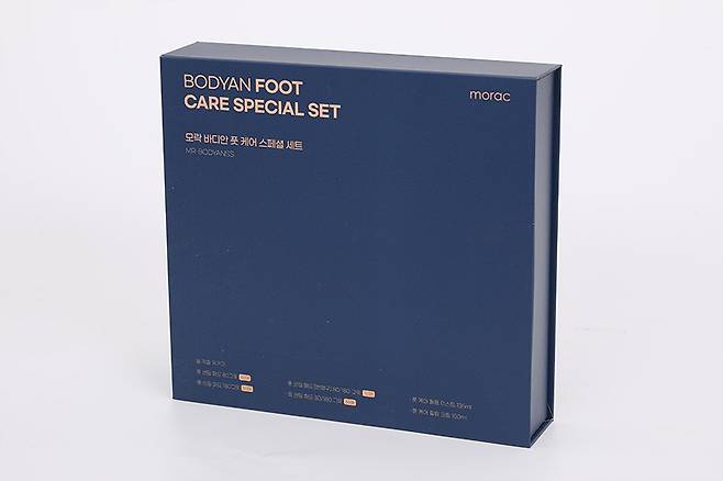 모락 바디안 전동 무선 발각질제거기는 푸른색의 단단한 박스에 담겨 있다. 박스에는 제품 이미지가 그려져 있지는 않고, ‘모락 바디안 풋 케어 스페셜 세트’라는 문구가 눈에 띈다.