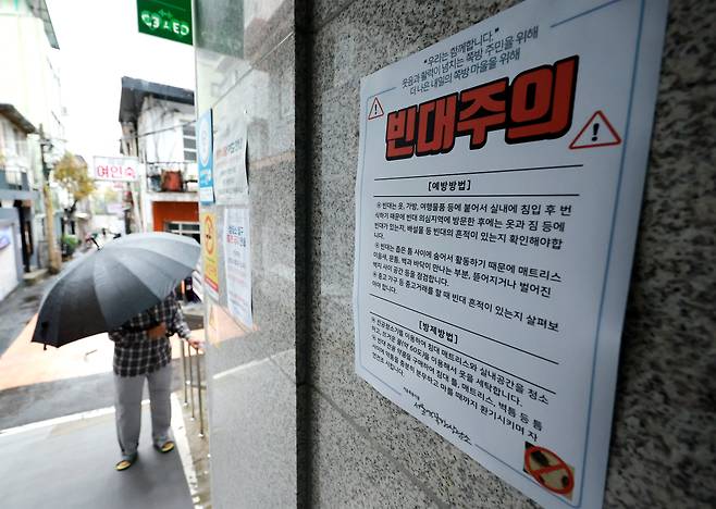 | ▲ 5일 서울 용산구 서울역쪽방상담소 입구에 '빈대주의'라는 문구와 함께 방제방법을 알리는 안내문이 부착돼 있다. 서울시는 쪽방촌·고시원 등 주거 취약계층이 많이 거주하는 유형의 공동주택에 집중되는 상황을 감안해 위생 취약 시설 빈대 방제에 예산 5억 원을 긴급 교부하고 빈대 발생 가능성이 큰 숙박시설, 목욕장, 찜질방 총 3175곳의 전수 점검을 시작했다. |