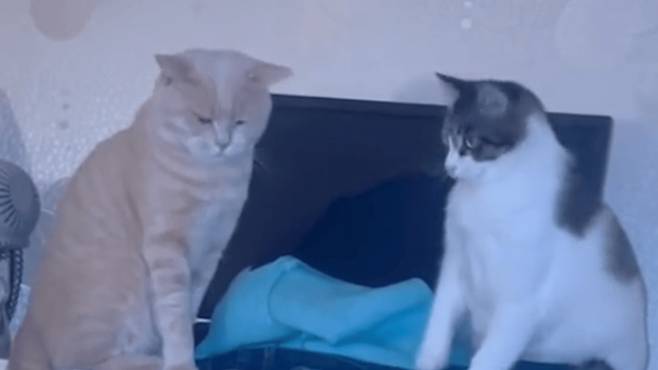 주황색 고양이는 황당한 듯 맹렬히 고개를 돌리며 "도대체 무슨 일이야?" 하는 표정을 지었습니다. 그때 얼룩 고양이는 재빨리 '연기 모드'로 전환해 자신의 발을 핥기 시작했고, 마치 아무 일 없다는 듯 무고한 모습을 연출했습니다.
