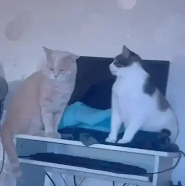 두 마리의 고양이가 컴퓨터 책상 위에 앉아 있었습니다. 얼룩 고양이가 작은 눈을 굴리더니, 주황색 고양이가 창밖을 깊은 생각에 잠긴 듯 바라보고 있었습니다.