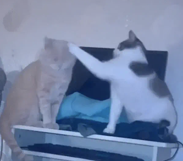 바로 그때 얼룩 고양이가 기회를 포착하고 살금살금 발을 뻗어 '찰싹' 소리와 함께 주황색 고양이의 머리를 살짝 때렸습니다!