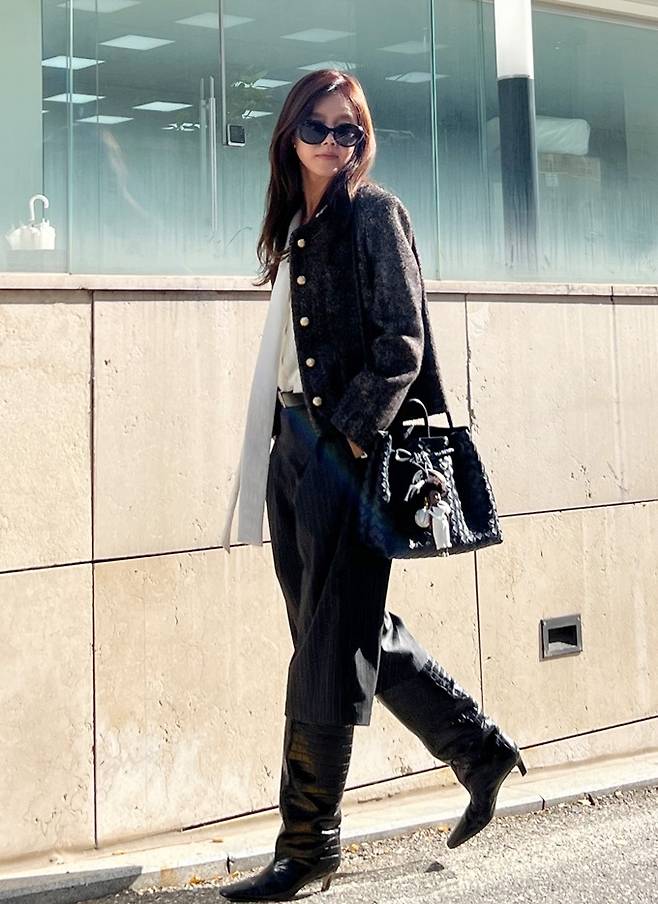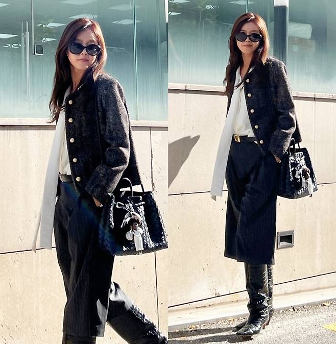 배우 채정안이 타이 블라우스 셔츠에 트위드 재킷으로 멋스러운 가을 드뮤어룩을 완성했다.