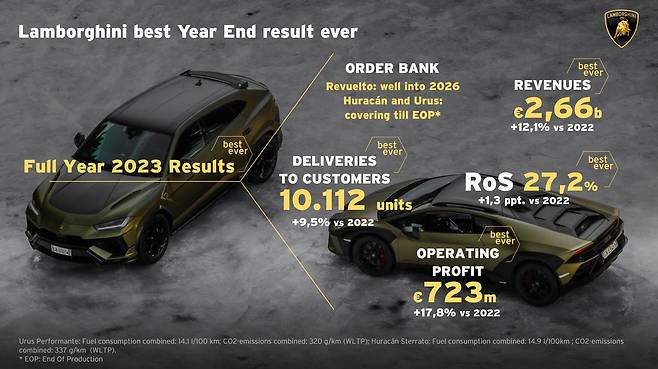 람보르기니 스테판 윙켈만 (Stephan Winkelmann) 회장은 "오토모빌리 람보르기니는 다양한 분야에서 신기록을 연이어 경신하고 있다. 우리의 선택과 비전이 옳았고, 회사의 유기적인 성장에 기여했다는 것을 의미한다.”라며 “7억 2,300만 유로의 영업 이익과 27.2%의 영업이익률로 우리의 전략이 옳았음을 확인할 수 있다. 우리는 미래를 대비하며 새롭고 도전적인 목표를 가지고 향후 몇 년을 계획할 수 있다. 2024년에는 새로운 우루스 플러그인 하이브리드 모델(PHEV)과 우라칸 후속 모델 발표를 비롯한 중요한 혁신과 오토모빌리 람보르기니 SC63의 FIA 세계 내구 선수권 대회 데뷔와 같은 새로운 도전이 이어질 것이다. 이는 새로운 이정표 달성을 위한 람보르기니의 끊임없는 노력이자 성장을 상징하는 도전이기도 하다."고 말했다.