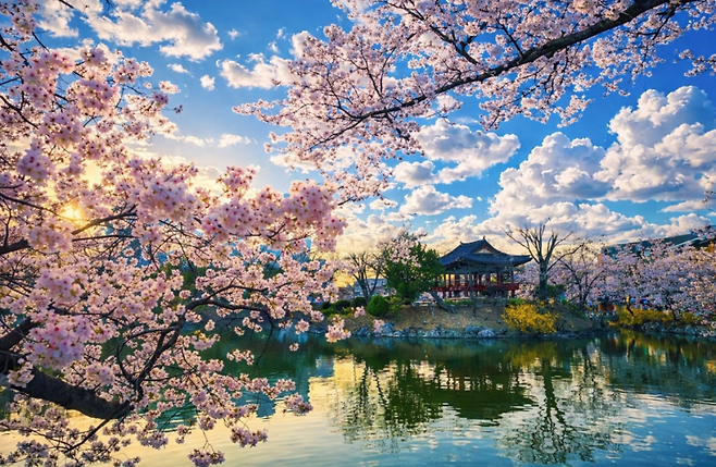 연화지의 봄은 벚꽃과 함께 시작됩니다.