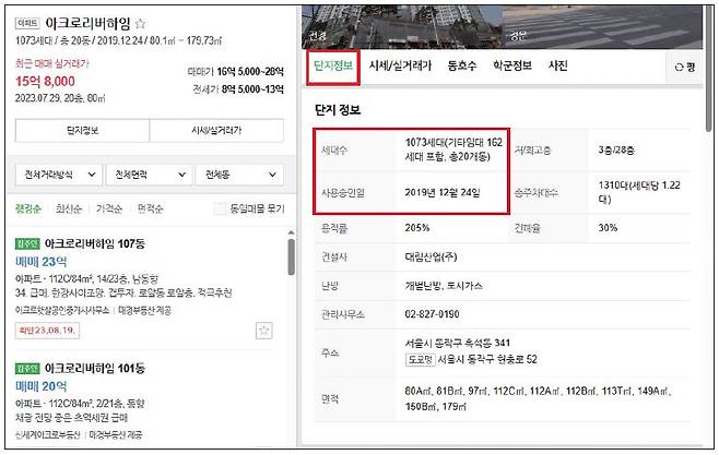 흑석9구역으로 임장을 갈 예정이라면 인근의 비슷한 신축 아파트로는흑석7구역이 재개발되어 2019년 12월에 입주한 아크로리버하임을 꼽을 수 있습니다. 네이버 부 동산에서 아크로리버하임을 검색해 ‘단지정보’ 메뉴로 들어갑니다. 아크로리버하임은 1,073세대이고 DL이엔씨의 하이엔드 브랜드 아파트이지요. 흑석9구역은 1,536세대이고 현대건설의 하이엔드 브랜드인 디에이치를 달게 됩니다. 이 정도면 입지나 아파트 브랜드, 세대 등 여러 가지를 비교해 보았을 때 흑석9구역이 아크로리버하임보다 좋으면 좋았지 뒤쳐지는 부분이 없으니 적당한 비교 대상입니다.