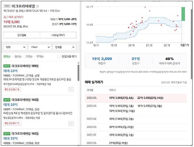 그래프 아래 ‘매매 실거래가’를 보면 112A㎡(34평)는 최근 22억 5,000만 원, 19억 3,000만 원에 실거래된 것을 확인할 수 있습니다. 왼쪽에 ‘매매’, ‘112A㎡’를 선택하면 매물들이 보이는데요. 23억 원, 25억 원에 매물이 나와 있습니다.